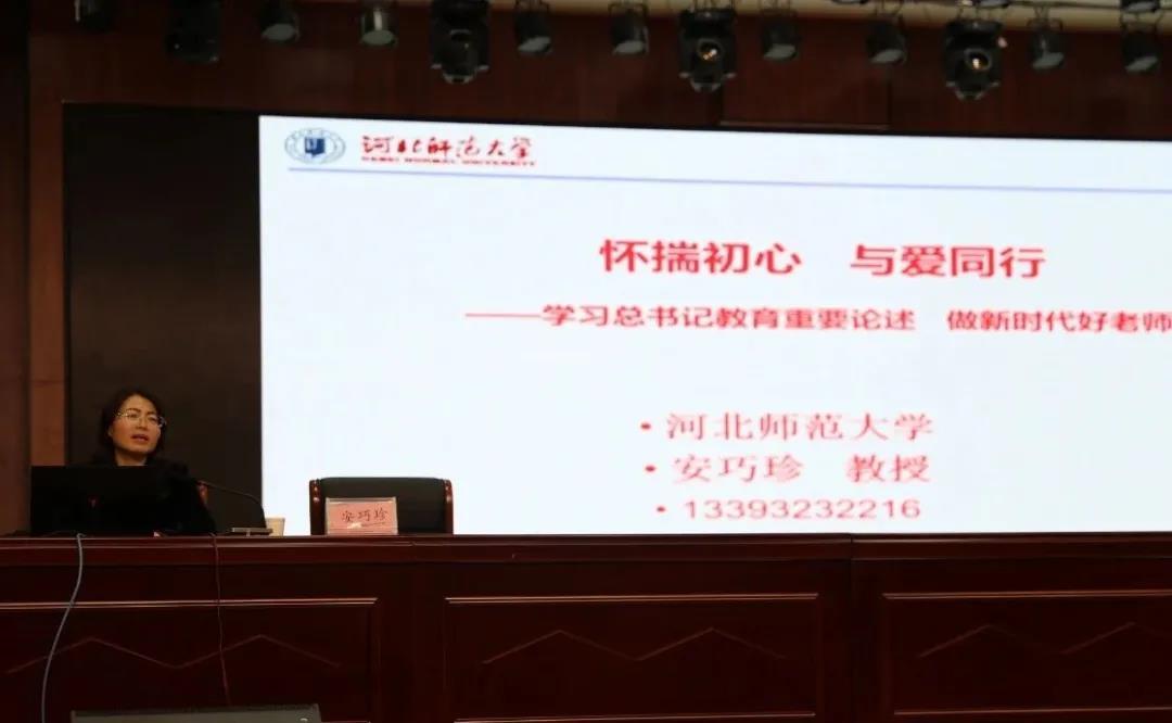黄琦授课题目为《教育从心开始》,分调整情绪、资源视角和有效沟通三部分讲授。课题深入分析了学生和教师在不同现状下的心理变化,结合现实案例,运用心理学讲述有效释放压力和面对负面情绪方法,指导教师们教育以情为先,培养学生在愉快中学习,改变厌学心理的情感。针对秩序不好的班级和学习后进的学生,黄琦提出教师要积极面对,强调正向力量而非缺陷,表扬努力过程而非问题,重视学生行动而非差距,总结成功经验而非失败,突出一切皆有可能而非有局限性的结果。在有效沟通方面,讲座要求大家建立良好师生关系、家校关系、同伴关系以及亲子关系,与学生交流以表明学生的优点开始,助力学生成为理想中的样子。 安巧珍讲座题为《怀揣初心、与爱同行》,高屋建瓴,以习近平总书记近年的教育论述为背景,指导教师学习和研究国家教育方针政策,了解国家教育内容体系,以仁爱之心服务教育。
